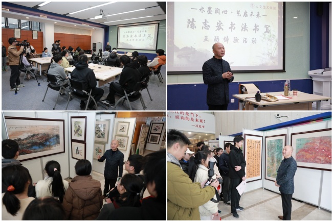 为践行“以美育人,以文化人”育人理念,提升我校师生艺术审美素养,由人文艺术学院主办的“水墨润心・艺启未来”陈志宏书画艺术展于3月28日在我校临港校区大学生活动中心开幕。
