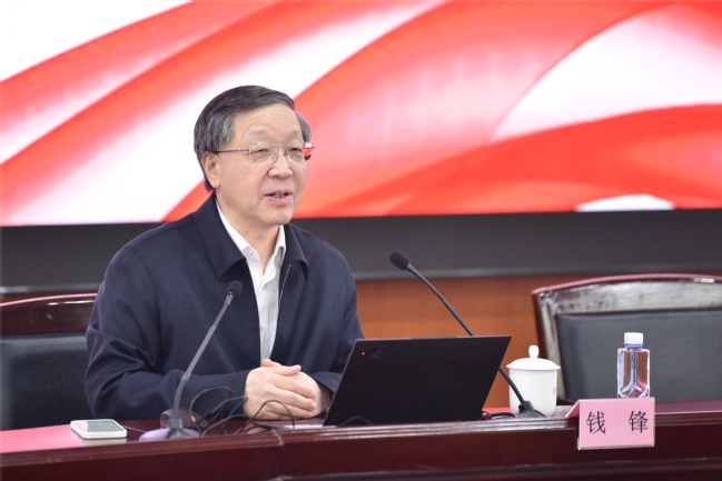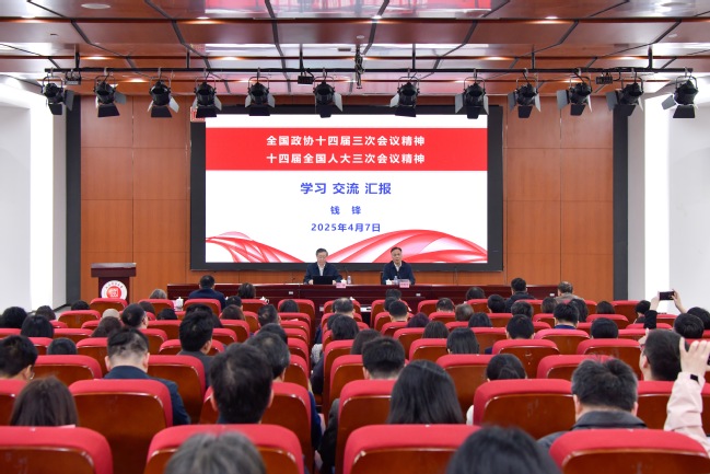 钱锋结合参会经历和学习体会,围绕“两会”的基本情况、两个工作报告主要内容、“两会”热点话题等作了深入浅出的解读,系统梳理了“两会”的核心议程与政策导向,既立足两会精神,又紧扣国家发展需求。报告通过解读“两会”政策蓝图,洞察国家发展脉搏,阐释了政府工作报告中十大新词背后的民生红利与产业新机。他还结合政府工作报告中的科技热词,强调了高水平科技自立自强的最新部署,指出要开展好有组织的科研和协同创新,加强科技成果的转化,深化教育科技人才一体改革。钱锋指出,习近平总书记在看望参加政协会议的民盟民进教育界委员时的重要讲话,就如何坚持正确办学方向、深化教育综合改革、强化教育对科技人才的支撑性作用等方面提出了明确要求,充分显示出党对教育工作的高度重视。作为高校,我们要把总书记关于教育、科技、人才的重要指示细化为路线图和施工图,推进教育高质量体系建设,同时要聚力科技创新和产业创新,发挥自身优势,打造产教融合、科教融汇的人才培养体系,为提升国家创新体系整体效能贡献智慧和力量。