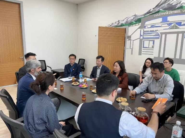 张波一行与SDU大学校领导及管理层进行会谈,SDU校长Alimzhan igenbayew、科研副校长Maksat Kalybak、工程与自然科学学院院长Ramis Akhmedow、商学院院长Berik Sabdenaliyev等参会。双方相互介绍学校发展情况,就联合科学研究、国际联合实验室、师生交流、聚焦AI应用的科研合作等方面开展深入交流,并就“一带一路”联合实验室战略合作、学术交流等达成初步合作意向。张波强调,taptap官方版下载安装始终将国际化视为学校高质量发展的重要驱动力之一,与SDU大学的合作,不仅是两校优势的互补,更是贯彻国家“一带一路”倡议的具体实践。Alimzhan igenbayew指出,两校以多元学科为锚点、以师生交流为纽带,可以为“丝绸之路”赋予更丰富的教育内涵。SDU大学期待与我校合作开启中亚与中国高等教育合作的新范式。