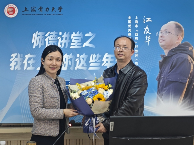 教师工作部副部长、人事处副处长诸俊为江友华老师献花,感谢江老师以渊博的学识为莘莘学子指引求知的道路,以高尚的师德为教育教学树起标杆,感谢江老师十八载的坚守与奉献。