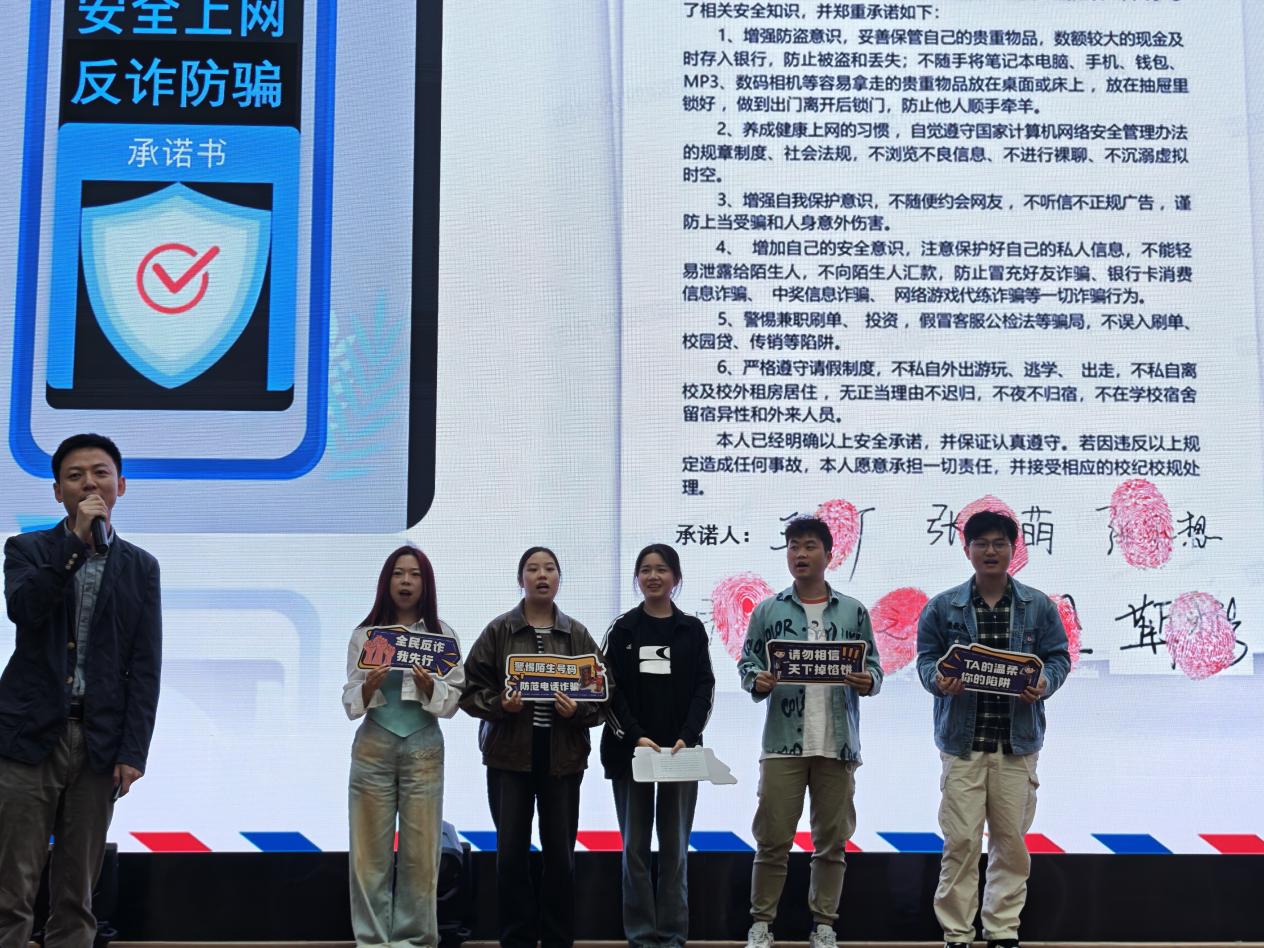 最后,周冬梅对学院在防范电信诈骗方面的重点工作进行介绍,并对同学们提出三点期望:一是做清醒的“防火墙”,提高防诈意识,用理性思维判断利益诱惑;二是当智慧的“安全员”,学习反诈知识,让知识技能成为抵御诈骗的有力武器;三是成互助的“预警哨”,既要守护好自己的“数字资产”,也要关心身边同学。她希望同学们将理性思考变成抵御诱惑的盾牌,让科技素养化为识别陷阱的利刃,期待全体电信学子以智慧为甲、以责任为矛,共同谱写平安校园的青春华章。