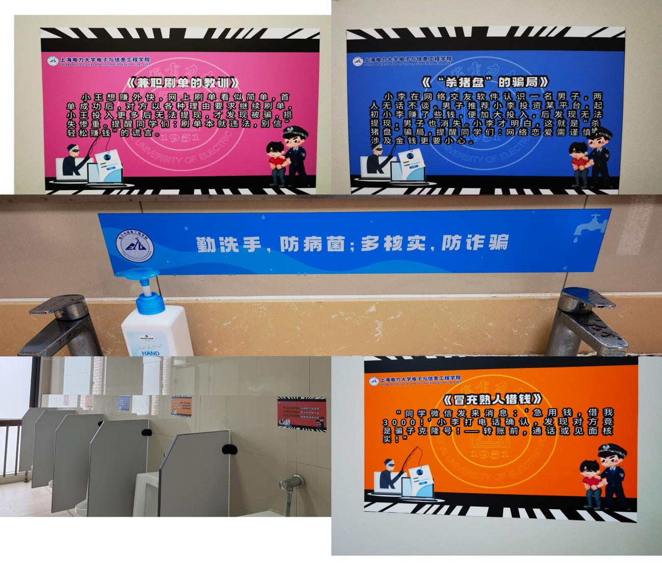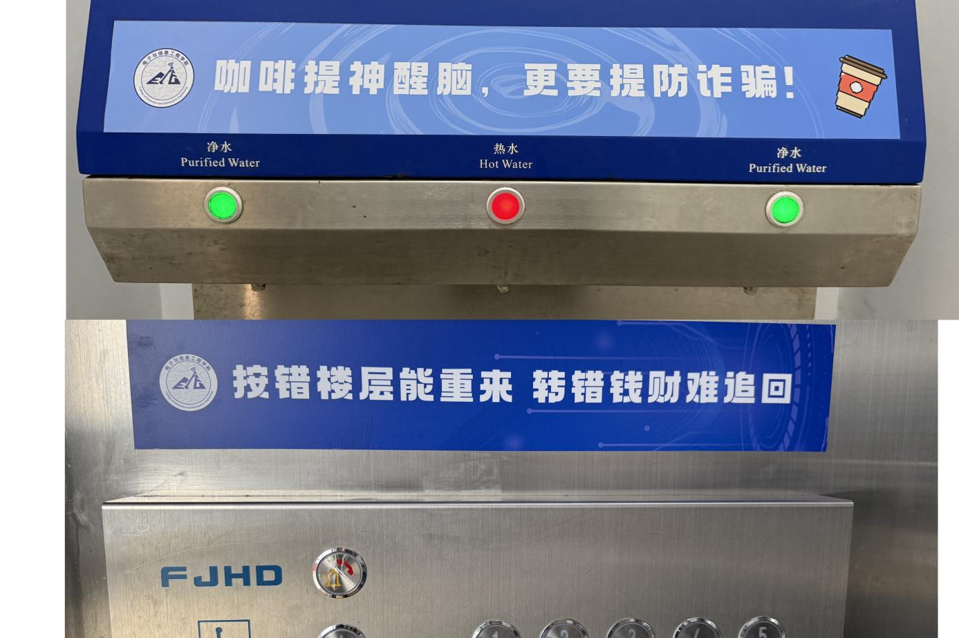 此外,在学院楼的楼梯台阶、饮水机、洗手间、电梯间等各处位置都张贴了有趣深刻的反诈标语、打油诗、诈骗案例等,如在饮水机处张贴“热水泡茶要等凉,转账汇款先别慌”、洗手池处张贴“勤洗手,防病菌;多核实,防诈骗”等,将反诈防骗安全教育全方位、无死角的融入日常生活中,确保安全宣传深刻到位。