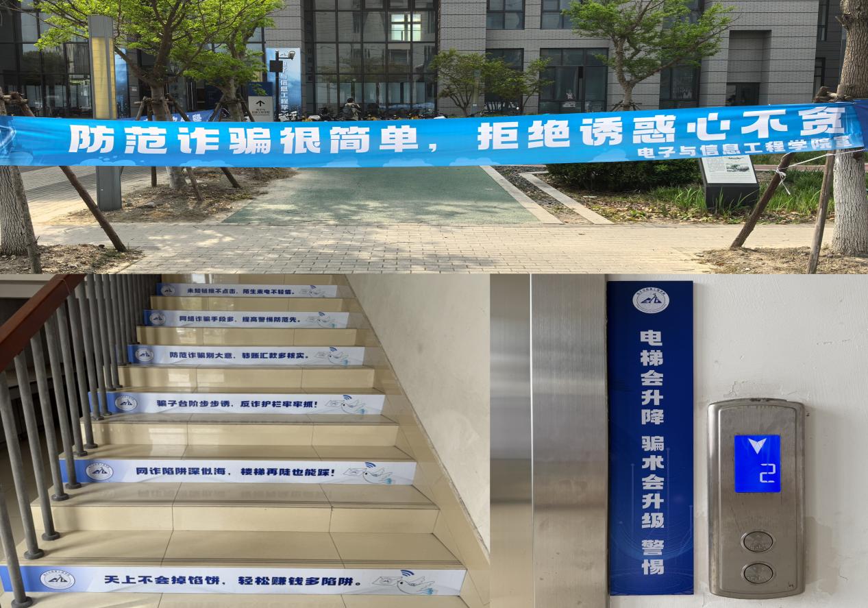 电信学院积极打造反诈防骗的浓厚氛围,突出“看得见、记得牢、随处在”的宣传理念。在学院主干道旁精心设置并悬挂多条醒目的反诈宣传横幅,内容鲜明、标语通俗易懂,如“警惕电信诈骗,守护财产安全”“陷阱馅饼分不清,日进斗金不要听”“防范诈骗很简单,拒绝诱惑心不贪”等,覆盖学生进出频繁、通行密集的关键区域。在潜移默化中提升师生识骗、防骗、拒骗的意识,营造出人人关注反诈、人人重视安全的浓厚校园氛围。