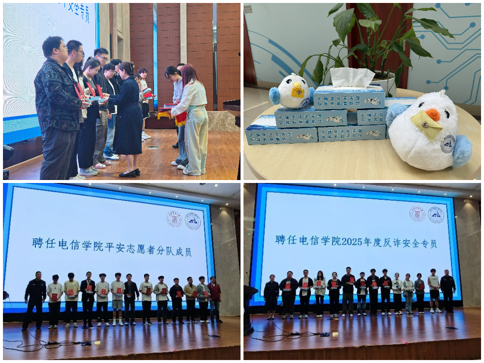 周冬梅和张华共同为电信学院2025年度反诈安全专员颁发聘书和反诈抽纸盒。王旭和张华共同为电信学院平安志愿者分队成员颁发聘书和反诈抽纸盒。反诈抽纸盒由学院学生自行设计,盒身醒目处印制“诈骗手段天天变,你我务必要防范”的警示语,寓意面对纷繁复杂、花样翻新的电信诈骗时,同学们能如同抽取纸巾一般,将层出不穷的诈骗手段层层剖析、逐一识破。有了这份日常生活不可或缺的反诈“利器”为伴,同学们将时刻保持高度警惕,构筑坚固心理防线,坚决对诈骗说“不”,让诈骗分子无缝可钻,远离上当受骗的风险。