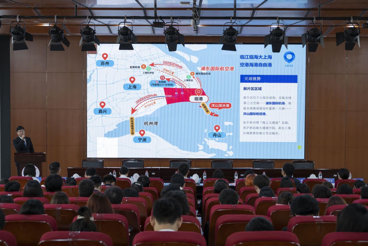 主题分享环节。临港新片区企业服务中心团委书记苏浩天以“年轻的城,年轻人的城”为主题作报告,结合临港新片区蓬勃发展的生动实践,深刻阐释新时代青年工作的创新路径与使命担当。他呼吁广大青年学子积极投身区域建设浪潮,“以青春之我,建设青春之城”,用智慧与汗水为这片热土注入生生不息的青春动能,在产城融合的壮阔征程中书写新时代青年的责任担当。