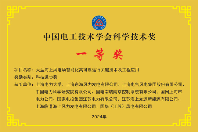 4月19日,2024年度中国电工技术学会科学技术奖颁奖大会在北京隆重召开。我校海上风电研究院牵头、符杨教授为第一完成人的“大型海上风电场智能化高可靠运行关键技术及工程应用”成果获中国电工技术学会科技进步一等奖。这是我校中国电工技术学会科技奖的首次重大突破,也是我校海上风电技术教育部工程中心、上海市高水平创新团队建设的重要成果。
