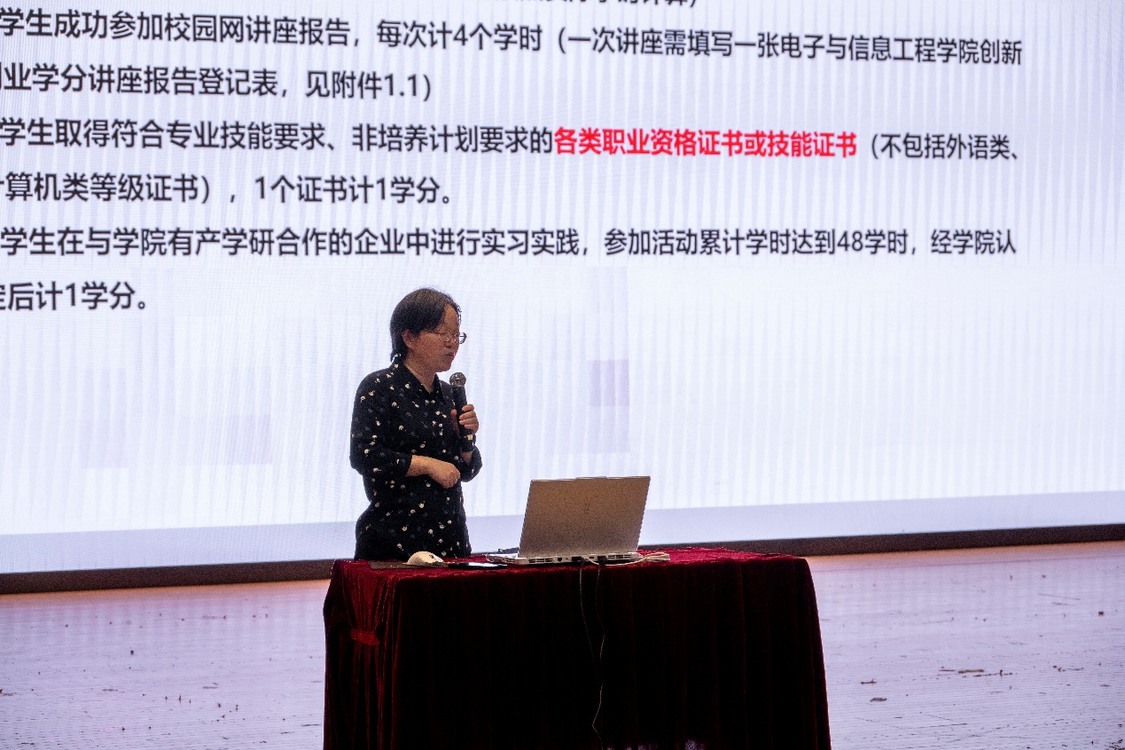 会上,赵琰细解读《电子与信息工程学院创新创业训练与实践学分管理办法》,从管理要求、考核办法、活动类型以及认证安排等方面展开介绍,详细讲解创新创业实践学分获取的多元途径,包括创新创业实践活动、学科竞赛、大学生创新项目、创业实践、学术论文及专利等内容。创新创业学分的设立旨在帮助学生更好地树立创新意识,激发科创兴趣,挖掘科研潜力,培养动手实践能力和团队协作精神,鼓励更多的学生能够参与到大学生创新创业中来。