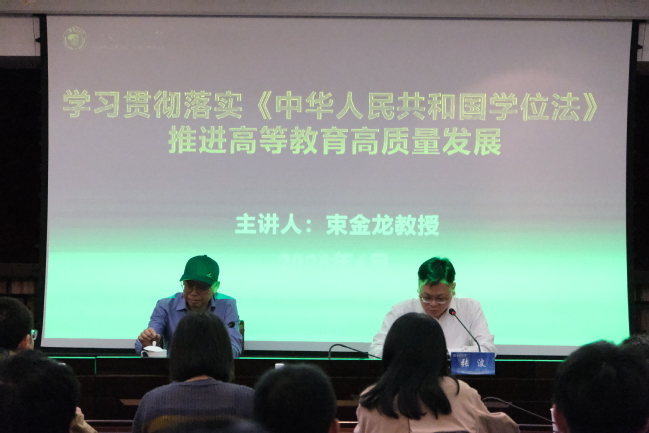 讲座中,束金龙教授系统梳理了《学位法》诞生的历史背景、基本内容及其特征。他详细解读了《学位法》的主要内容,深入分析其实践应用、实施后学位授予工作诉讼风险及实务要点。束教授围绕《学位法》的立法背景、核心条款与实施路径展开系统阐释,重点剖析法律条文背后的逻辑脉络,他强调,《学位法》是我国教育法治体系中的一部关键性法律,对于规范学位授予流程、保障学位授予质量、促进高等教育事业的持续健康发展具有至关重要的作用。