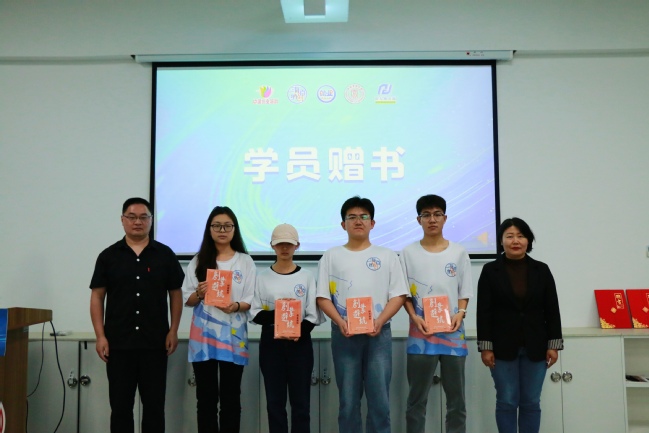 在学员赠书环节,王华君与数理学院党委副书记赵月琴共同为学员代表赠送学习书籍,勉励学员夯实理论基础。