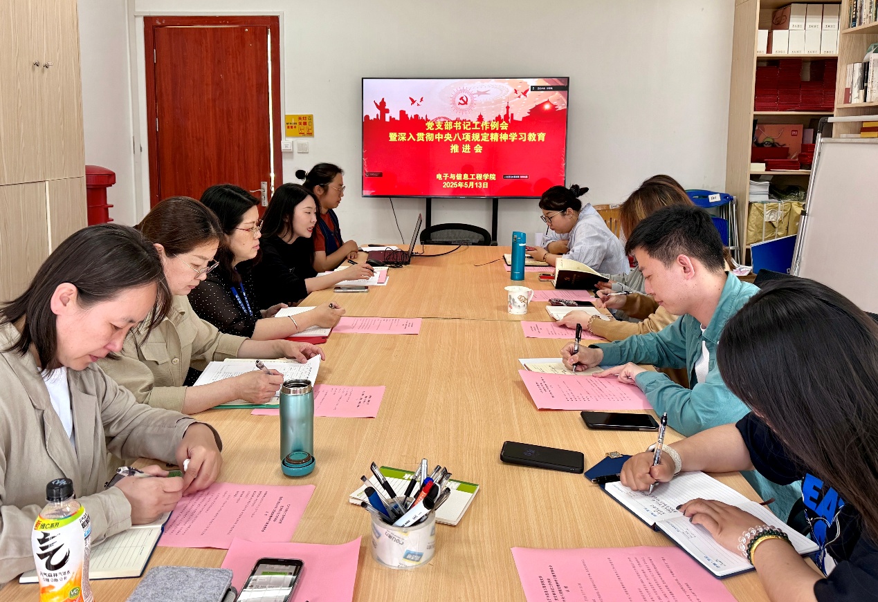 为扎实推进深入贯彻中央八项规定精神学习教育,持续加强党的作风建设,进一步激发党员干部担当作为、干事创业的内生动力,全面提高党建工作质量,推进党建与业务深度融合,5月13日下午,电信学院在电计楼B401会议室召开党支部书记会议。学院党委书记何西培、党委副书记周冬梅和全体党支部书记参会,会议由学院专职组织员修绍梅主持。