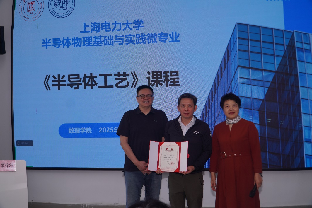 4月26日下午,上海台协科创工委会总干事、欢芯鼓伍半导体平台创始人、青岛大学微纳技术学院教授罗仕洲博士受邀为“半导体物理基础与实践”微专业授课。数理学院副院长孙玉芹担任开课主持人。课前,孙玉芹与上海积塔半导体有限公司资深总监许端格博士为罗仕洲博士颁发课程特邀教师聘书。