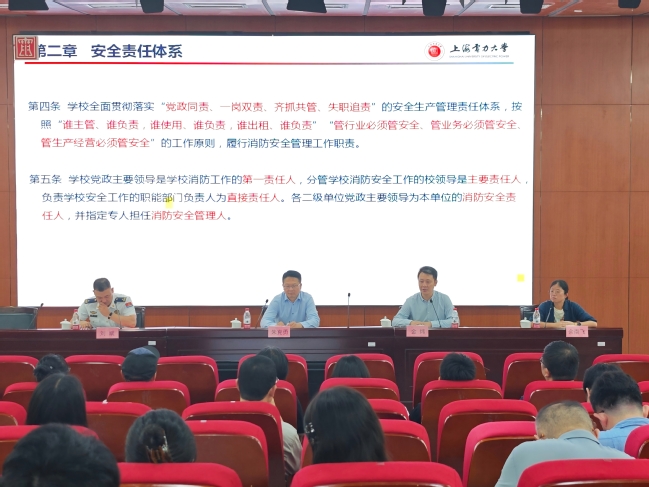 为切实加强校园消防安全管理,防范火灾事故发生,保障师生生命财产安全,有效开展消防安全检查、宣传、应急演练等工作,5月21日下午,学校消防安全管理员聘任仪式暨业务培训会议在学术楼103报告厅举行。校党委副书记、副校长朱克勇出席会议,临港消防大队消防参谋刘斌、保卫处处长金炜、副处长余南飞及各二级单位消防安全管理员参加会议。