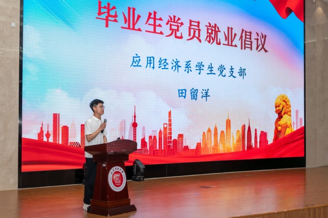 党员代表田留洋宣读就业倡议,号召全体毕业生党员提高政治站位,积极投身就业实践,发挥先锋模范带头作用,主动宣传政策,增强防骗意识,将个人奋斗的“小目标”融入国家发展的“大蓝图”,争做“一面旗帜、一个堡垒”。