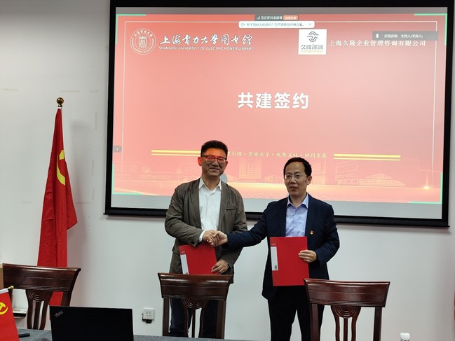 为积极探索党建工作与高校文化服务、电力行业咨询服务的融合路径,加深党建工作的深度融合,搭建校企之间协同发展、互促共赢的新起点,5月20日,图书馆党支部与上海久隆企业管理咨询有限公司党支部共建签约。上海久隆公司党支部书记徐涛、副总经理杨小静、运营总监李永、党务专职王杉芸、资深项目经理张堰华,以及联合党总支书记张洁、图书馆党支部书记、图书馆副馆长董建忠,图书馆党支部党员、馆员、经济与管理学院师生代表参加。