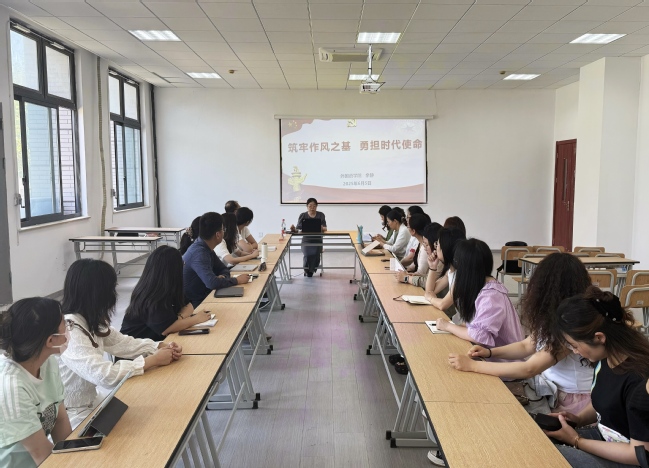 6月5日,外国语学院党委书记余静在经外楼B101会议室,以“筑牢作风之基 勇担时代使命”为主题讲授学习教育专题党课,党建服务中心/党建督查室主任马进明出席指导,学院师生党员参会。