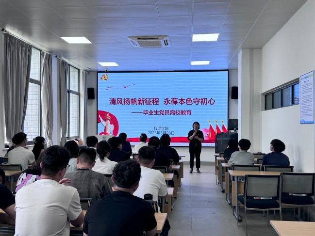 为进一步坚定毕业生党员理想信念、强化毕业生党员身份意识,以更加饱满的热情投身到未来的工作和社会生活中,5月28日,数理学院在数理楼A110会议室开展以“不忘初心 廉洁远行”为主题的2025届毕业生党员离校教育大会。会议由学院兼职组织员杨雪艺主持,学院党委副书记赵月琴、学生党支部书记和全体毕业生党员参加。