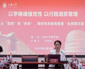 上海大学理学院王岑岑以《以学铸魂强党性以行践诺抓管理》为主题,介绍了理学院聚焦党员教育管理“全周期培育、全链条提升、全方位赋能”,构建从 “入党启蒙” 到“终身教育” 的闭环体系,推动党员教育管理提质增效的经验做法。