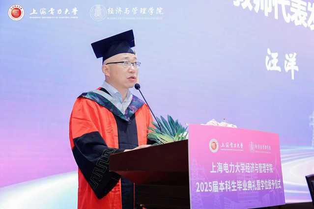 经管学院学位委员会委员、工程管理系主任汪洋作为教师代表发言,为即将踏入社会的学子指引方向。面对全球产业链重构、AI 重塑商业逻辑的复杂局势,汪洋提出四点建议:将不确定性转化为创新机遇,凭借专业知识在新兴领域发光发热;以专业能力建立确定性,在决策中践行管理学精髓;保持动态成长,持续更新知识技能;守护价值理性,坚守道德与原则。最后,他鼓励毕业生,凭借疫情入学、经济复苏转型期毕业所锤炼的韧性,以专业智慧和努力适应并塑造时代,书写属于自己的辉煌篇章。