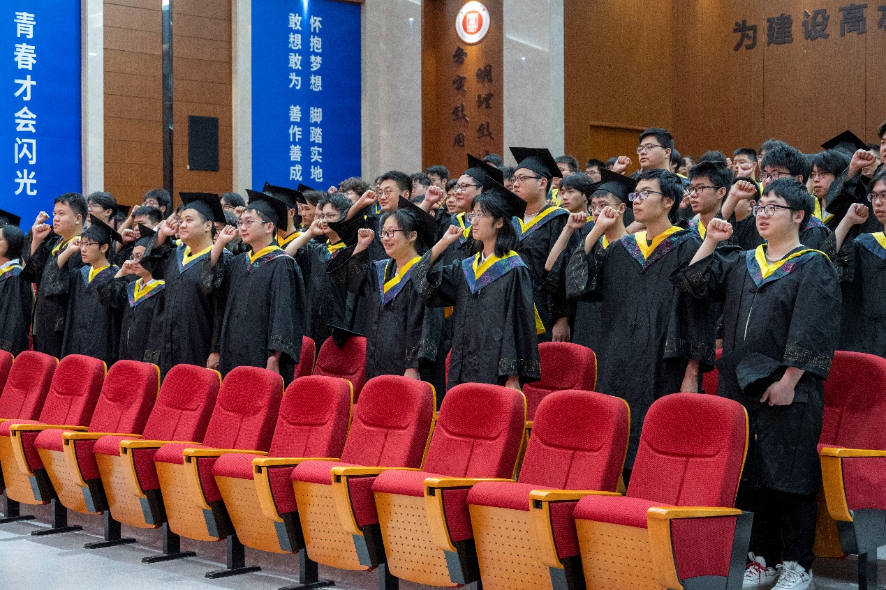 全体毕业生在毕业生代表李镒先同学的领誓下进行庄严宣誓。他们承诺将铭记校训和院训精神,坚定理想信念,脚踏实地,砥砺前行;传承时代精神,不畏艰险,勇担使命;把个人理想追求融入党和国家事业之中,以青春之我、奋斗之我,为民族复兴铺路架桥,为祖国建设添砖加瓦。誓言铿锵有力,回荡在报告厅的每一个角落,也深深烙印在每一位毕业生的心中。