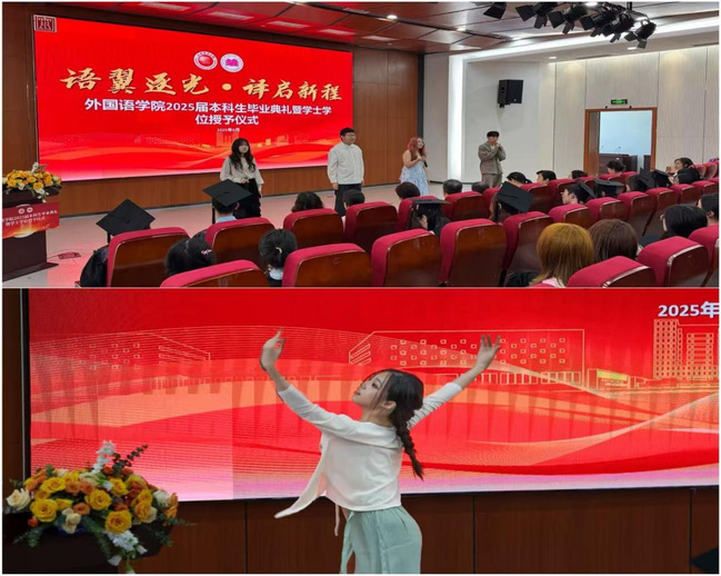 暖场视频《拾光·寄语:外院青春纪念册》带领师生回顾了2025届学子四年的成长足迹;肖筝、俞腾俊、张佳依、张旖旎、朱庭宇带来歌舞《这世界有那么多人》,代表学弟学妹们为毕业生送上祝福,为典礼注入温暖底色。