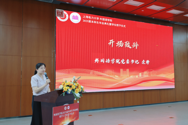 6月6日,外国语学院2025届本科生毕业典礼暨学位授予仪式在学术楼103报告厅隆重举行。学院党委书记余静、副院长陈宗利、党委副书记余嘉、副院长冯为兰,以及各系部主任、专业负责人、教师代表、毕业生家长代表共同见证这一庄严时刻。