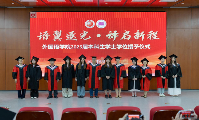 最后,陈宗利宣读学士学位授予决定,与会教师代表共同为毕业生拨穗正冠、合影留念,为大学四年时光划上圆满的句号。典礼在温情与豪情中落幕。祝愿每一位外院学子前途似锦,一路生花;扬帆远航,续写华章。