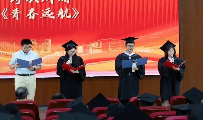 在激昂的旋律中,毕业生代表及毕业班辅导员共同朗诵诗歌《青春远航》,吹响新征程号角,全体毕业生向老师们鞠躬致谢,再次表达对母校、师长的感恩和感激之情。