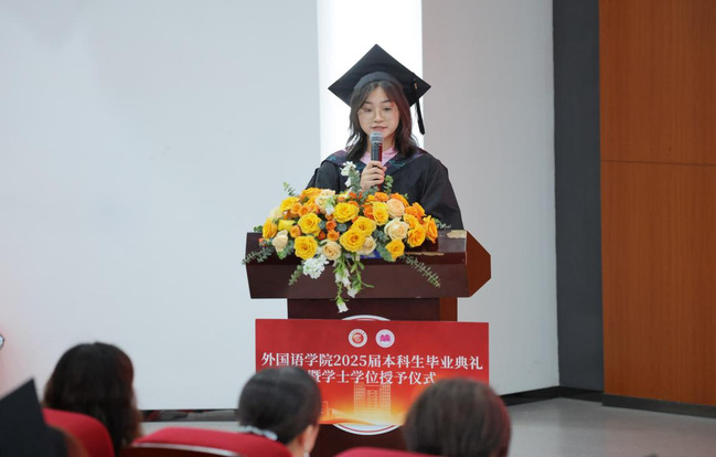 在庄严的国歌声中,典礼正式拉开帷幕。余静在致辞中代表学院向圆满完成学业的2025届毕业生致以热烈祝贺和美好祝福,并提出三点期许:一是以包容之态去拥抱未来人生,用广博胸襟容纳多元世界,肩负外语人使命,传播中华文化、讲好中国故事,做文明交流的使者;二是用克难之勇去翻越每座高山,永葆乐观心态,在挑战中自我成长;三是用友爱之心去传递每份温暖,诚实守信,以诚待人,“让世界因你们更美好”。她勉励毕业生们“做一个高尚、纯粹、有道德、有益于人民的人!”
