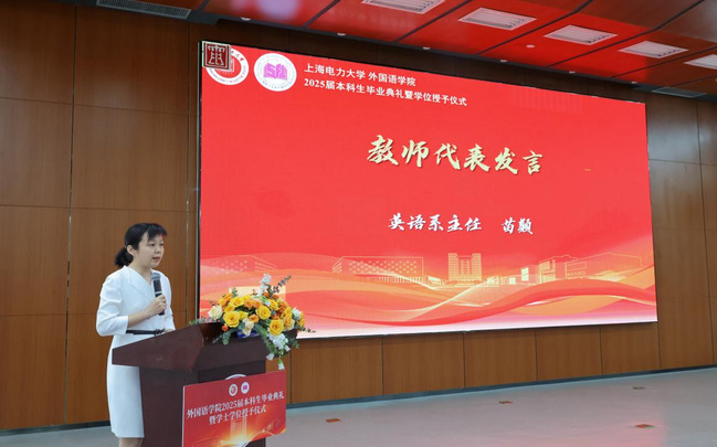 教师代表、英语系主任苗颖寄语学子不忘初心,终身学习;以开阔胸襟拥抱变化,用专业能力书写未来。