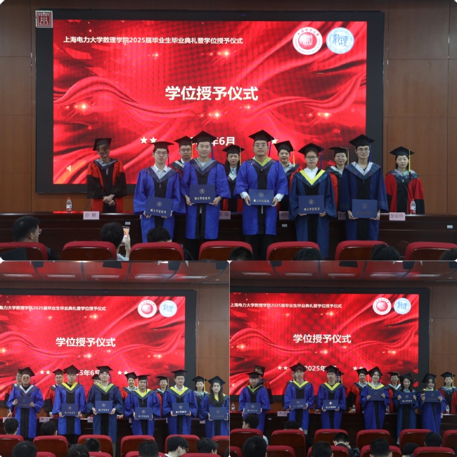 随后,本科生和研究生学位授予仪式举行,仪式由孙玉芹和林佳主持。朱瑞分别宣读《关于授予2025届数理学院本科毕业生学士学位的决定》和《关于授予2025届数理学院研究生毕业生硕士学位的决定》。朱瑞、孙玉芹、林佳、朱燕艳、彭麟、李丽珍六位教授分别为本科毕业生授予学士学位和研究生毕业生授予硕士学位,并扶正流苏。