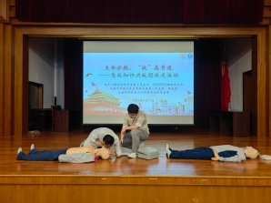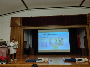 吴坤为在场师生系统讲解了心肺复苏(CPR)和自动体外除颤仪(AED)在突发事件中的重要意义,详细介绍了CPR的判断步骤、按压手法与节奏控制要点,以及AED的结构原理、使用流程与常见误区,并通过图文资料、案例分析和科普视频相结合的方式,让大家对CPR与AED的规范操作有了更为直观且清晰的认识。在掌握基本理论之后,同学们分组进行实操练习,依次在人体模型上完成CPR、AED贴片定位等急救操作,两位主讲医师耐心指导,逐一纠正操作细节,确保每位参与者都能掌握要领、规范施救。