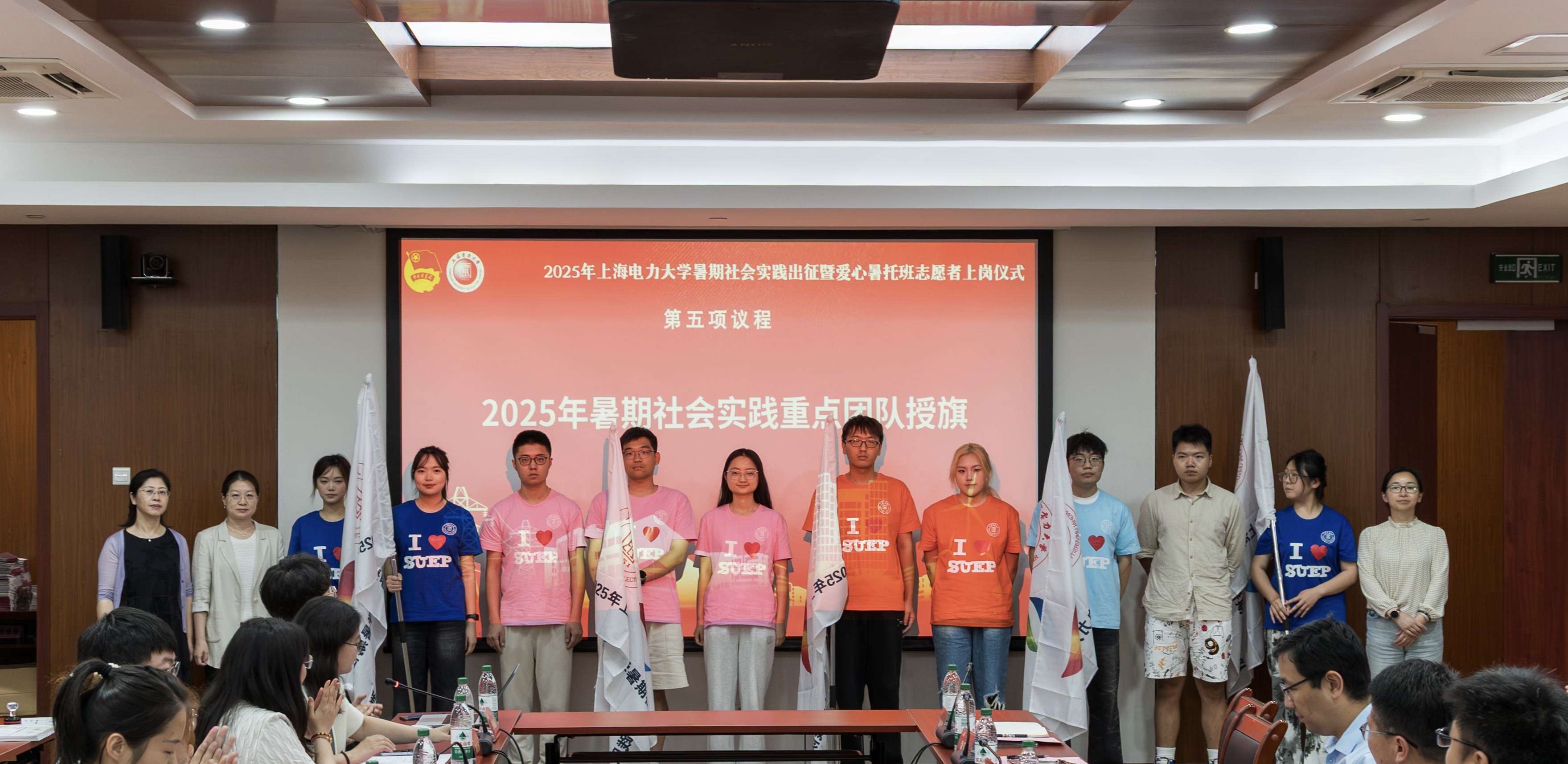 能源与机械工程学院党委副书记周婷、环境与化学工程学院党委副书记涂莹亮、电子与信息工程学院党委副书记周冬梅为2025年暑期社会实践重点团队授旗。