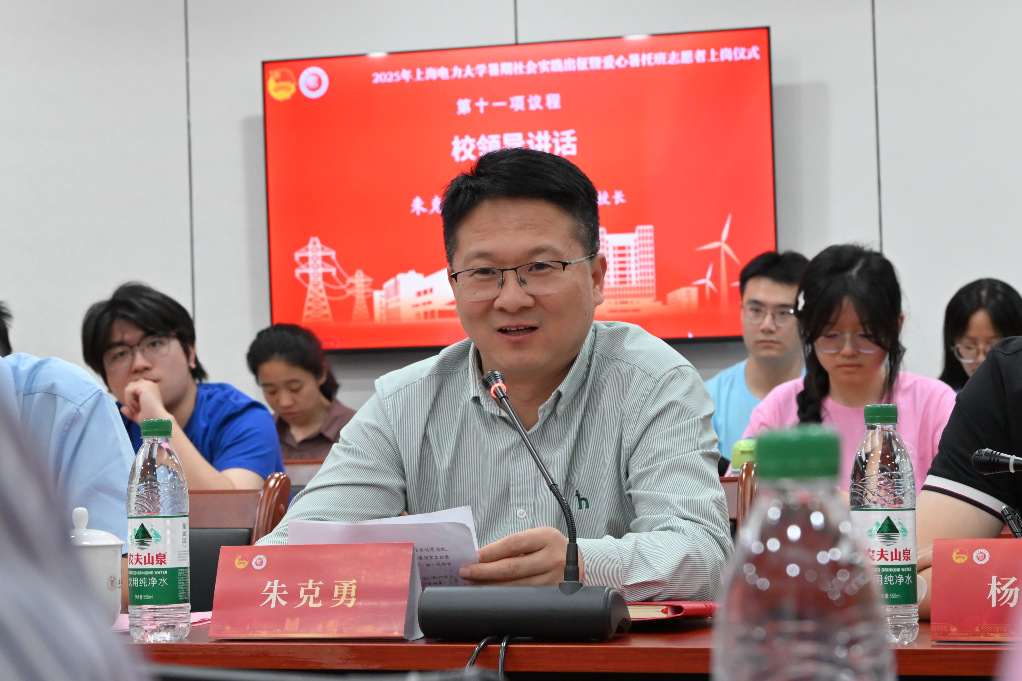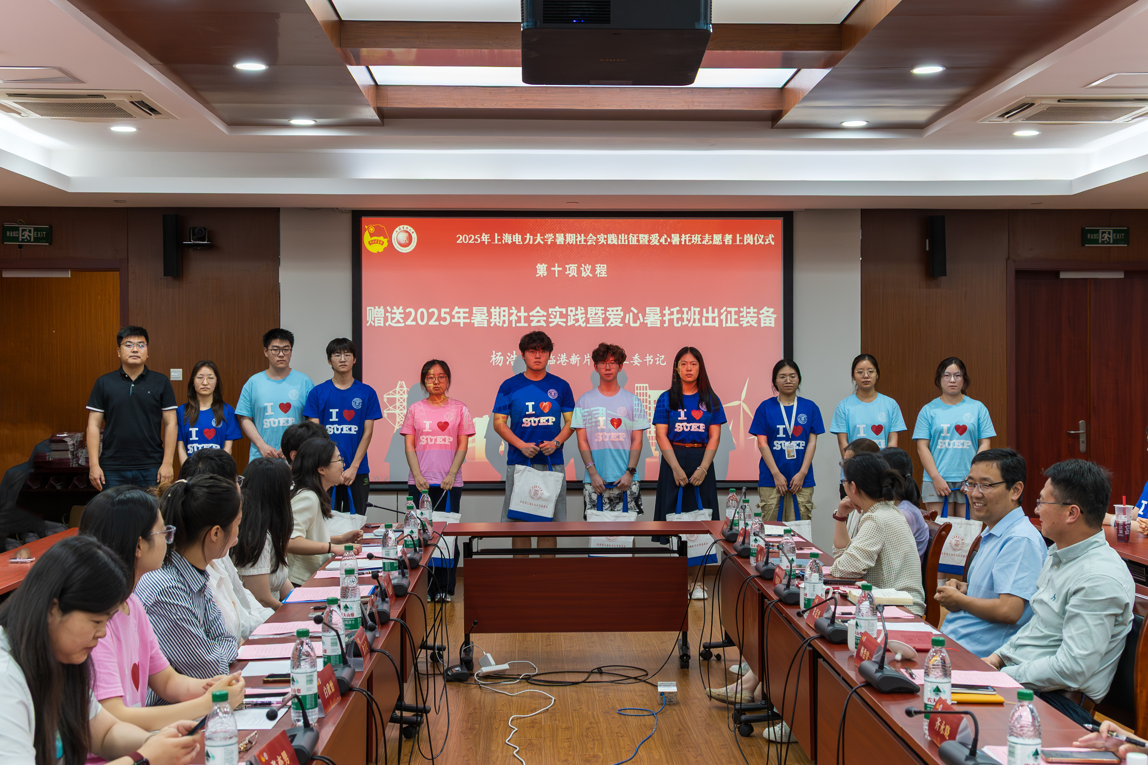 杨浩昊为我校暑期社会实践团队代表及爱心暑托班志愿者代表赠送2025年暑期社会实践暨爱心暑托班出征装备。