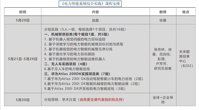 本次选题采用“软件+硬件+AI+能源电力”结合的模式。在前序课程《人工智能技术及电力系统应用》中,学生已经分组开展初步实践,实现了“AI+电力”的软件设计或相关算法,在此次课程中所有选题均增加“硬件”模块。根据硬件的类别,分为机械臂项目类、Appolo无人车类、华为开发板类三大类,其在能源电力场景的应用包括电力智能巡检系统、电力智能运维系统两大类,三类硬件九个实践题目,覆盖两大能源电力应用场景。