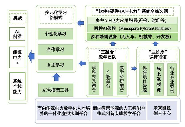 为破解人工智能快速发展背景下,面向“AI+能源电力”数智化应用型人才培养的人工智能实践课程教学的三个难题:一是课程教学如何体现能源电力特色,以支撑能源电力数智化人才培养;二是课程内容如何与人工智能前沿技术发展衔接;三是如何解决学生只懂软件开发,不懂硬件应用,不具备计算机系统全栈思维,不了解计算机在实际生产中的实际应用。人工智能课程组按照工程教育OBE的教学理念,在教学实践中坚持“以学生发展为中心,紧贴技术发展前沿,服务能源电力行业”的理念,基于学校建设的三个高水平实验平台,创新地设计了“三融合”教学团队(跨学科交叉融合、产教融合、教学科研融合)、“三维度”教学资源库(线上视频课资源、科研项目资源、行业企业案例资源),以及与AI辅助编程工具快速发展背景相适应的具备“软硬全栈、个性化学习、合作学习”特色的创新教学模式。