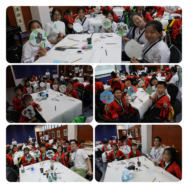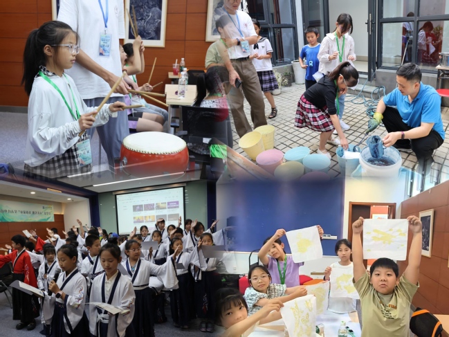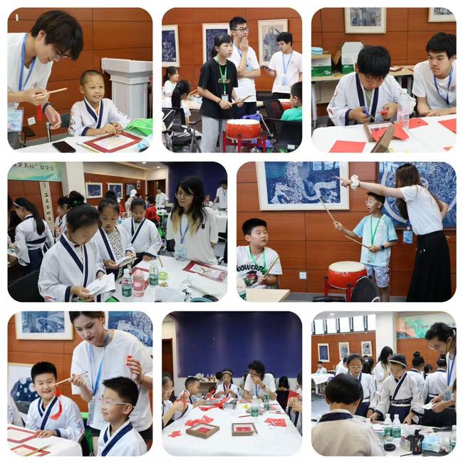 《画·古韵纸扇》课堂里,许晶老师带领学生们领略纸扇文化内涵,鼓励大家用手中的画笔,将听到的故事以及对“美”的感悟描绘在扇面上,进一步加深了对传统纸扇文化内涵的理解。梁爽老师的《听·民间故事》课程通过讲述中国古代民间故事,让孩子们在精彩的故事中体会到中华文化的丰富内涵。《舞·童趣海韵》课程上,马晨老师以中国非遗舞蹈山东海阳大秧歌为基础,通过经典作品赏析、肢体探索两大模块,运用游戏化、故事化的教学方式,探索非遗舞蹈的艺术表达。《诵·古典诗词》课程中,张翯老师带领学生们在悠扬的诵读声中,加深了他们对传统文化的理解和热爱,与古人进行了一场心灵的对话。黄欣老师在《奏·古风遗音》课上带领孩子们击鼓为乐,打击节奏、传递信号、表达情感,仿佛置身于古代乐师们击节而歌的热闹场景。《蓝染文化体验》课程成为了孩子们发挥创造力的舞台,浦育川老师带领孩子们体验非遗传统艺术扎染的制作过程,从扎结到染色,每一个步骤都充满了惊喜和挑战,孩子们创造出了属于他们的独特蓝染作品。