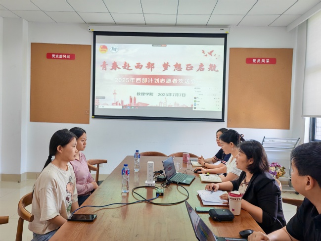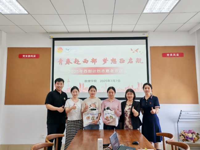 7月7日,数理学院以“线上+线下”相结合的形式举办2025年西部计划志愿者欢送会。会议由学院党委副书记赵月琴主持,志愿者代表、院团委书记康鸿轩、志愿者导师及辅导员出席。