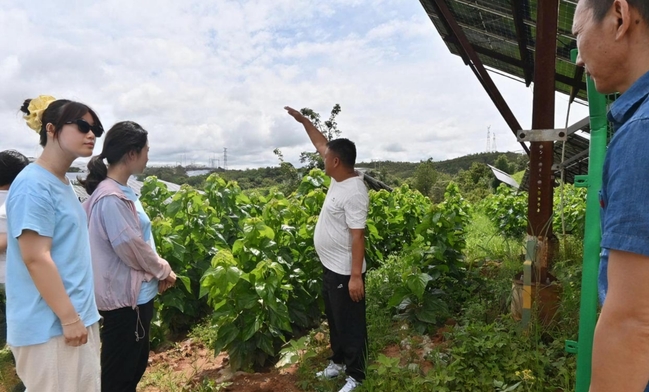 次日,团队前往维的乡调研“农光互补”创新模式。在中国华电光伏基地,队员们学习了大型光伏电站的运行原理,并就团队研发的碳排放模型与技术人员展开交流。跟随荣丽种养殖合作社社长李文荣的讲解,团队深入考察“板上发电、板下种桑”的复合利用模式,实地验证光伏板遮阴效应对桑树生长的改善作用。团队走访安装屋顶光伏板的农户以了解实施成效,并于维的村活动中心开展光伏维护宣讲,发放自编技术手册,切实服务当地需求。