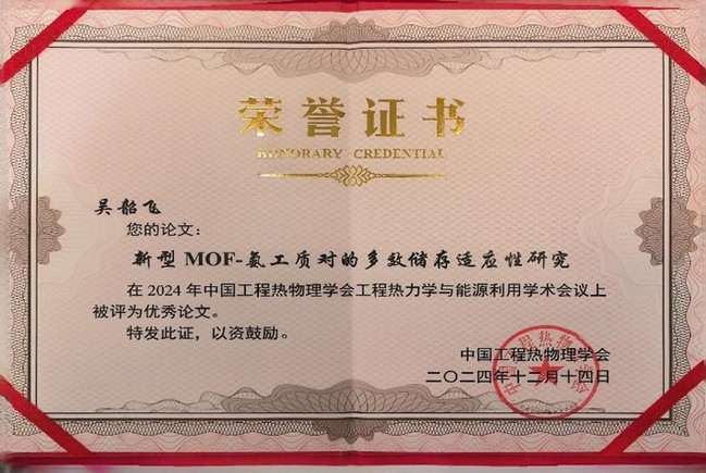 基于该论文的探索性研究成果《新型MOF-氨工质对的多效储存适应性研究》在2024年中国工程热物理学会工程热力学与能源利用学术会议上被评为大会优秀论文奖。该工作研究了ZIF-8(Zn)复合吸附剂-氨工质对的储热、制冷与储氨性能,在高温环境制冷和低温环境供热工况下展示出优异的温度适应性。