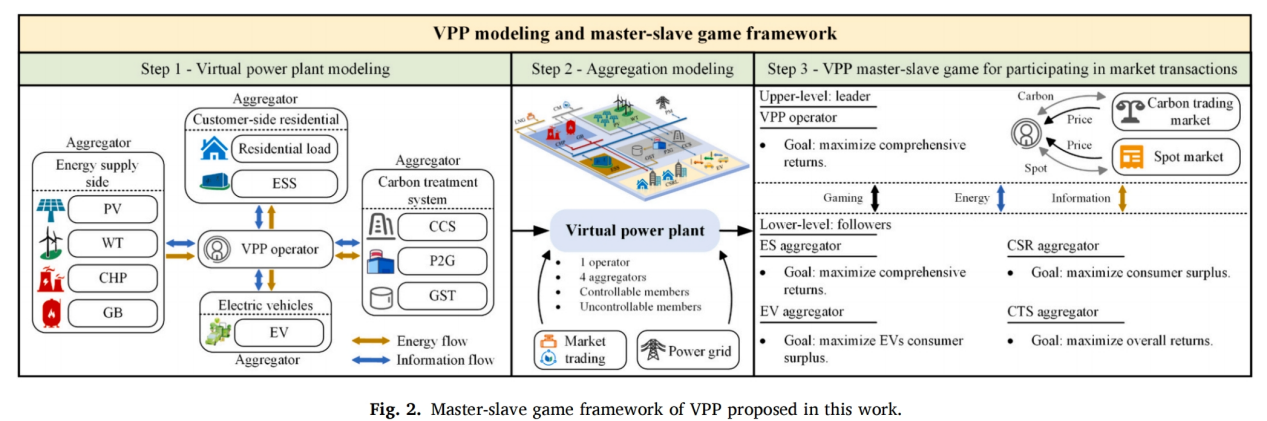 多主体优化调控方面,在《Applied Energy》上发表题为“Optimal scheduling of multiple entities in virtual power plant based on the master-slave game”的论文,提出了一种基于主从博弈的虚拟电厂多主体最优调度策略。主要贡献在于构建了含电动汽车与碳处理系统的综合能源虚拟电厂多主体运行模型,全面考虑多种能源交易及碳排放,充分兼顾消费者满意度、能源供应方经济性与电厂低碳性,突破现有调度模型单电能市场局限,实现多能源形式下的优化配置;提出基于Stackelberg主从博弈的多主体最优调度策略,构建用户满意度能效模型及多主体博弈模型并证明其均衡唯一性,提升调度效率,增强系统在不同市场环境的适应性与稳定性,有效协调各主体利益关系;运用NOA-QP组合算法制定能量定价策略,通过分布式均衡求解避免信息泄露,保护隐私,同时显著提高算法收敛速度与电厂运行效率,为虚拟电厂优化调度提供高效的解决方案,相比传统算法优势显著。