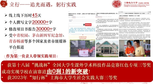在大家的努力下,该实践项目获上海市教育系统社会主义核心价值观建设典型案例;获得第十八届“挑战杯”全国大学生课外学术科技作品竞赛红色专项三等奖,成功实现学校在此赛道由0到1的突破;获 2023年“知行杯”上海市大学生实践大赛三等奖。
