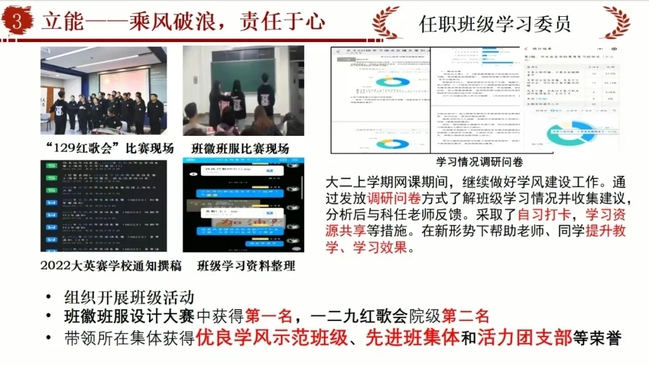大二任职班级学习委员期间,吕姝君带头学风建设。通过发放调研问卷方式了解班级学习情况并收集建议,分析后与科任老师反馈。在新形势下,采取了自习打卡,学习资源共享等措施,帮助老师、同学提升教学、学习效果。