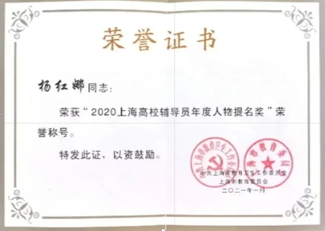 杨红娜老师始终将每个学生放在心里,悉心指导,用心引导。作为思政辅导员,杨红娜老师受到各方的肯定,先后获得上海市育才奖、校优秀教育工作者、“我心目中的好老师”提名奖等荣誉。