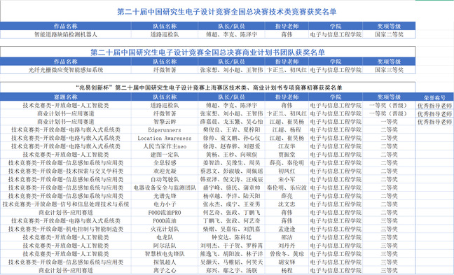 近日,第二十届中国研究生电子设计竞赛(研电赛)全国总决赛在深圳落幕。在全国总决赛中,由蒋伟老师指导的“道路巡检队”团队(队长傅超,队员李克、陈泽宇)荣获技术类竞赛上海赛区一等奖并成功晋级全国总决赛,最终获得全国二等奖;由卞正兰、初凤红老师指导的“纤微智著”团队(队长张家想,队员刘小超、王智伟)获得商业计划书专项赛上海赛区一等奖并晋级全国总决赛,最终夺得商业计划书团队全国三等奖;由江超、崔昊杨老师指导的“智擎云眸”团队(队长薛嘉晨,队员戈玉繁、吴心怡)同样表现优异,荣获商业计划书专项赛上海赛区一等奖。学校被授予“上海赛区优秀组织奖”,蒋伟、卞正兰、江超三位指导老师被评为“上海赛区优秀指导老师”。