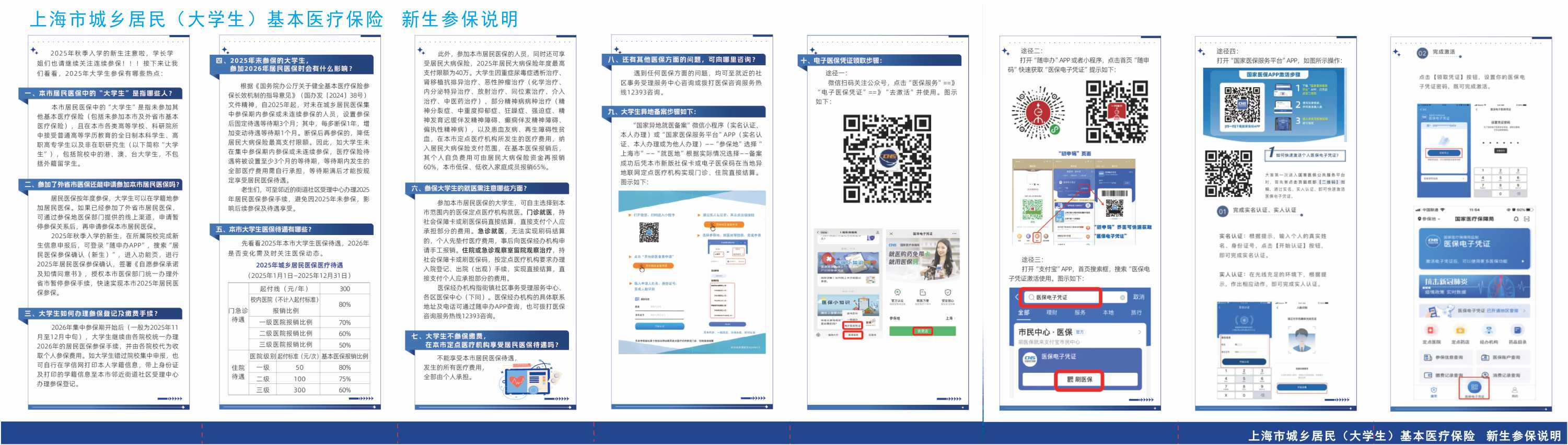 据上海市医保局、市教委、市卫健委有关通知文件精神,上海市各类高等院校、科研院所中接受普通高等学历教育的全日制本科学生、高职高专学生以及非在职研究生(以下统称“大学生”)将纳入上海市城乡居民基本医疗保险范围,从入学报到并注册学籍后可免费享受当年(2025年)大学生基本医疗保险待遇至2025年12月31日。在上海市的医保定点医院持卡(刷医保码)就医,可以实现即时医保结算,按比例报销医疗费用。具体事项说明如下: