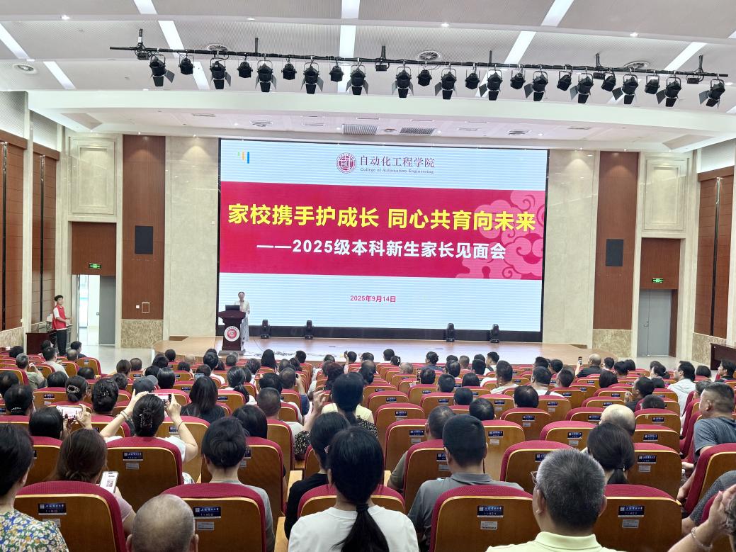 为搭建家校沟通桥梁,凝聚协同育人合力,助力新生顺利开启大学生活,9月14日下午,自动化工程学院在临港校区学术楼117报告厅召开2025级本科新生家长见面会。学院党委书记刘莉,党委副书记、院长彭道刚,党委副书记王佳丽出席会议,辅导员陈炜、薛楚恒及新生家长共300余人参会。会议由王佳丽主持。