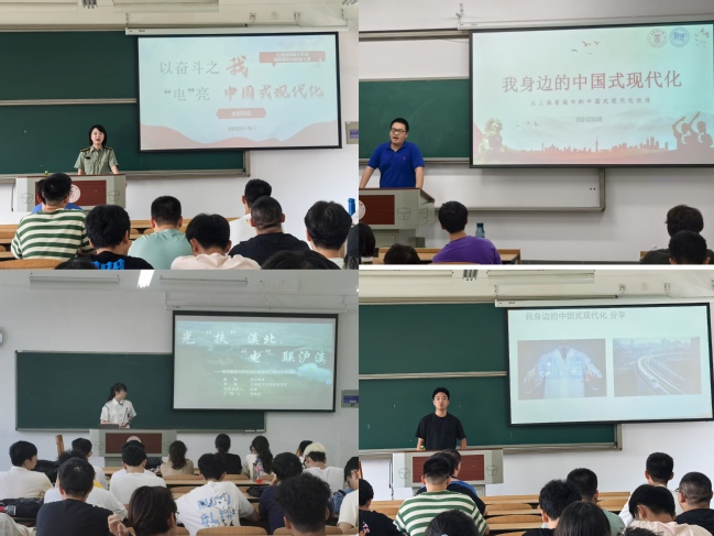 在“我身边的中国式现代化”分享环节,学生们结合自身观察与实践经历,从乡村振兴、科技发展、生态保护等多个视角,讲述身边的“中国式现代化故事”。暑期社会实践学生代表分享光“扶”滇北,“电”联沪滇——光伏提灌与农光互补赋能对口帮扶实践调研情况。通过分享实践调研的成果和经验,引导学生关注社会热点问题,积极参与社会实践,将理论知识与实际应用相结合,增强社会责任感和实践能力。通过“身边事”解读“大时代”,同学们更加清晰地认识到中国式现代化的丰富内涵与实践路径,也明确了个人成长与国家发展的紧密联系,进一步坚定了把个人理想融入国家大局的信念。