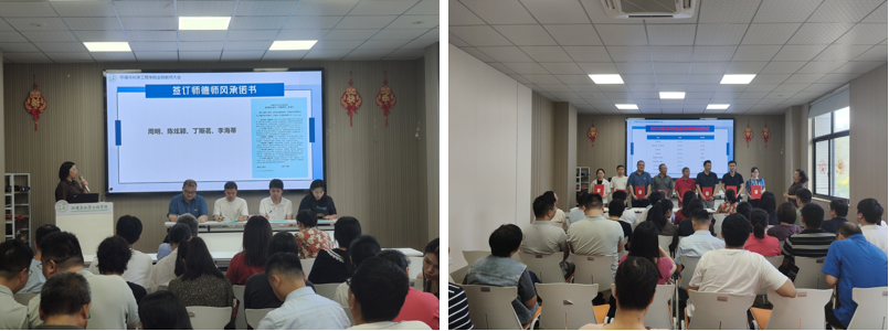 新进教师周明、陈炫颖、丁斯茗、李海蒂依次签订《环境与化学工程学院教师职业规范(师德师风)承诺书》,以书面形式郑重承诺严守职业底线、恪守育人初心。陶莹再次向全体教师重申要求,强调将师德师风内化为职业自觉,既要严格遵守“不碰红线、不越底线”的纪律规范,更要主动涵养“以德立身、以德立学、以德施教”的高尚师风,切实担当起学生健康成长的“引航者”。随后,会议举行了2025级本科生班导师聘任仪式。这支由八名新老教师组成的班导师队伍,将为后续的学业指导、思想引领、生涯规划等精准化育人工作提供坚实保障。