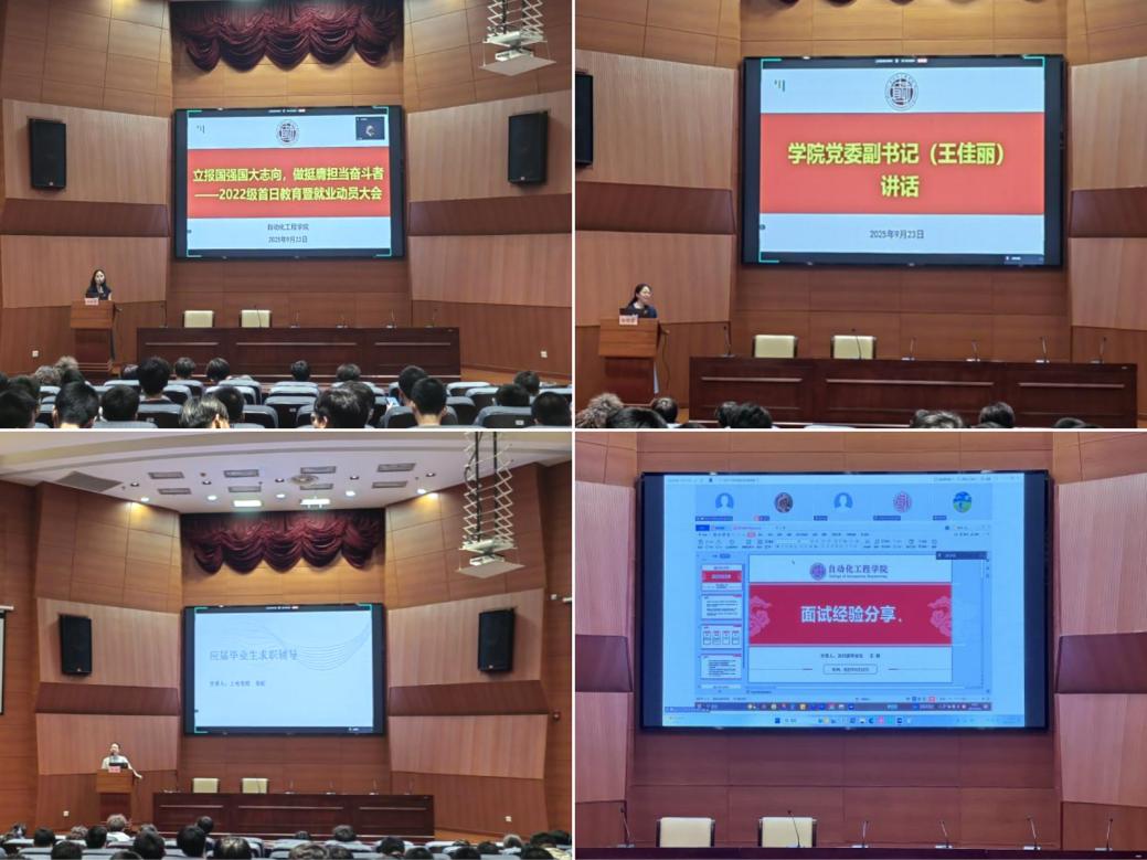 为进一步引导广大学生坚定理想信念,树立报国强国之志,努力成为堪当强国建设、民族复兴大任的栋梁之材,新学期初,自动化工程学院围绕“立报国强国大志向、做挺膺担当奋斗者”主题,精心组织并扎实开展了内容丰富、形式多样的首日教育活动。活动覆盖学院全体本科生,由各年级辅导员牵头组织,学院党政领导班子、新生班主任、企业HR、朋辈榜样等共同参与。