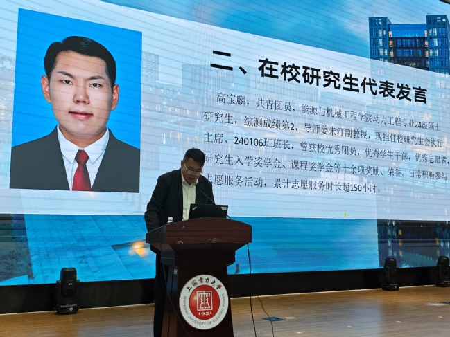 在校生代表高宝麟以“过来人”视角分享了成长心得;新生代表沈亿轩表达了将以严谨求实的态度投身学术、追求卓越的坚定信念。